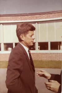 In September of 1958  Senator Kennedy arrived at Mansfield High School to talk with students about service to their country. Not just service in the military but service in government as well as civil service. Anything that would make our country a better place to live. His short speech in our small auditorium was resoundingly meaningful and awe-inspiring to this sixteen year old sophomore Industrial Arts Major. I also played the trumpet in the Mansfield High School Marching Band and the baritone in the concert band. Our auditorium had an orchestra pit right below the stage. What a thrill it was to be playing the baritone in the concert band right next to this charismatic man. The band played George Washington's March for JFK'S visit and he loved it so much he shook our hands when he left.