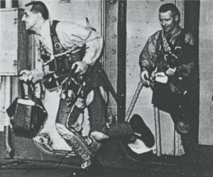 After the pilot preflights the plane, the plane captain follows the pilot up the ladder to strap him into the cockpit. The cockpit was very small and the pilot was loaded down with cumbersome gear. The pilot was wearing flight skins to keep him warm, his G-suit which when inflated it keep him from blacking out during high G force maneuvers. He carried his flight log in a pouch over one shoulder and a 38 calibre revolver in a bandolier over his other shoulder. The pistol was loaded ready for a parachute  landing in enemy territory. The bandolier was packed with tracer ammunition as well as lead slugs for firing tracer rounds at search crews and slugs at the enemy. He sat on his life raft which would deploy at nine thousand feet  along with his parachute. After strapping his pilot into the cockpit it was time for the plane captain to remove the safety pins in his ejection system in the cockpit. This system kept the ejection seat from firing until the pins were removed. There were also pins behind the seat that only the plane captain could reach. After climbing down the ladder the plane captain would show the pilot the pins displayed between his fingers and wait for the pilot to give him a thumbs up. Next the plane captain would close and lock the cockpit. Then the plane captain would remove the ladder put the pins along with the tie down chains in the chain bag hanging from the catapult hook. The huffer would arrive equipped with a small jet engine in back. The huffer driver would insert the pneumatic probe he carried on his tug. Then he would hook up the hose to the probe and signal the plane captain that he was ready. The plane captain would then signal the pilot the plane was ready to start the engine with a hand signal in a circular motion. The noise was so deafening it was impossible to talk, all communications had to be with hand signals. After the plane was started the plane captain removed the starting probe. Giving the pilot time to check his engine and other instruments he pulled the the pins in the landing gear, and tail hook, holding them displayed between his fingers until the pilot gave him a thumbs up. Next the plane captain signaled the pilot to move his ailerons, move his rudder, drop the tail hook, open & close the speed brakes and move his elevator up to the takeoff position after each move was completed he signaled the pilot with  a thumbs up. Once all systems were checked the plane captain gave a salute to the pilot which he returned. At that point the plane captain would turn his plane with pilot over to the plane director. The plane captain would then put the chain bag with safety pins and eight tie down chains on his ladder, then wheel it through the mass of planes in various stages of staging for launch to the island secured it ready for his aircraft to return.The plane director would then guide the aircraft to the catapult. The catapult crew would hook up the bridle to the catapult hooks, then secure the plane to the deck with a breakaway connection located in the upper end of the planes tail-hook. The pit crew located in a pit next to the catapult would get the planes gross weight from the planes nose wheel and set the steam dials. He then signaled the catapult officer the correct steam pressure was dialed in. The catapult officer would then give the pilot a thumbs up indicating the catapult systems were dialed in. At that point the cat officer signaled the pilot to turn his engine up to 100% throttle, then waited for the pilot check his engine systems. If all his systems were a go the pilot would salute the cat officer and brace himself to be shot off the deck. The cat officer saluted the pilot, swept his hand towards the foredeck which was a signal to the bosn mate in the pits to fire the catapult. This was a force equal to being shot out of a cannon.