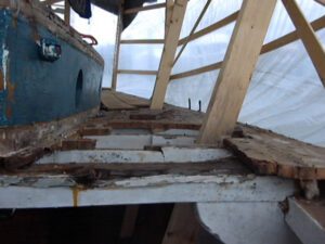 Her first winter in the water exposed far more rot than I had anticipated but failure was not an option. The green hull paint had been removed now it's time to remove the green cabin. By jigging the cabin clamp & deck carlings I was able to hoist the cabin top high up in the tent with block and tackle. Once jigged this enabled the removal of the cabin clamp, cabin bulkheads and deck carlings. Fortunately the shear clamp, shelf and stringers all original were in fine shape.