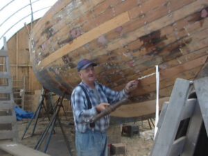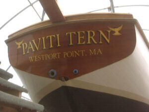 The spring of 2005 found us in a quonset hut tent with a new helper, Richard Cottreau. He was an extraordinary master shipwright from Wedgeport, Nova Scotia. He was brought to this country by Mackenzie to build his famous Cuttyhunk bass boats of which he built hundreds of them. Many are still in use today. In his youth he had worked many years in the shipyards in Lunenburg Nova Scotia. There was not a task that Richard could not handle from keel bolts to topmast, he could do it all. Without his help the restoration of PATIENCE would have not been possible. The tent was provided by FL TRIPP & SONS free of charge. She was launched and christened with her previous name PAVITI TERN in the spring of 2006. She had no mast or interior to allow her to take up after so many years of her being out of the water.
