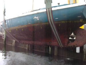 The spring of 2005 found us back in the quonset hut tent ready to begin the final phase of the project, installing bulkheads, water tanks, fuel tanks, hatches, bunk, chart table, anchor locker, ceilings, nav station and head. All the appurtenances necessary for her to be a fully found sailing vessel. The final touch was to install her name and home port. This is mandated by US Coast Guard regulations.