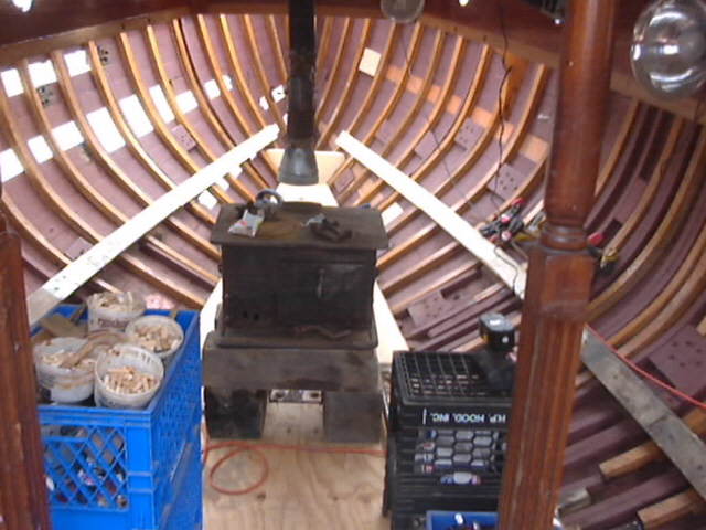The spring of 2005 found us back in the quonset hut tent ready to begin the final phase of the project, installing bulkheads, water tanks, fuel tanks, hatches, bunk, chart table, anchor locker, ceilings, nav station and head. All the appurtenances necessary for her to be a fully found sailing vessel. The final project was to install her name and home port in gold leaf.