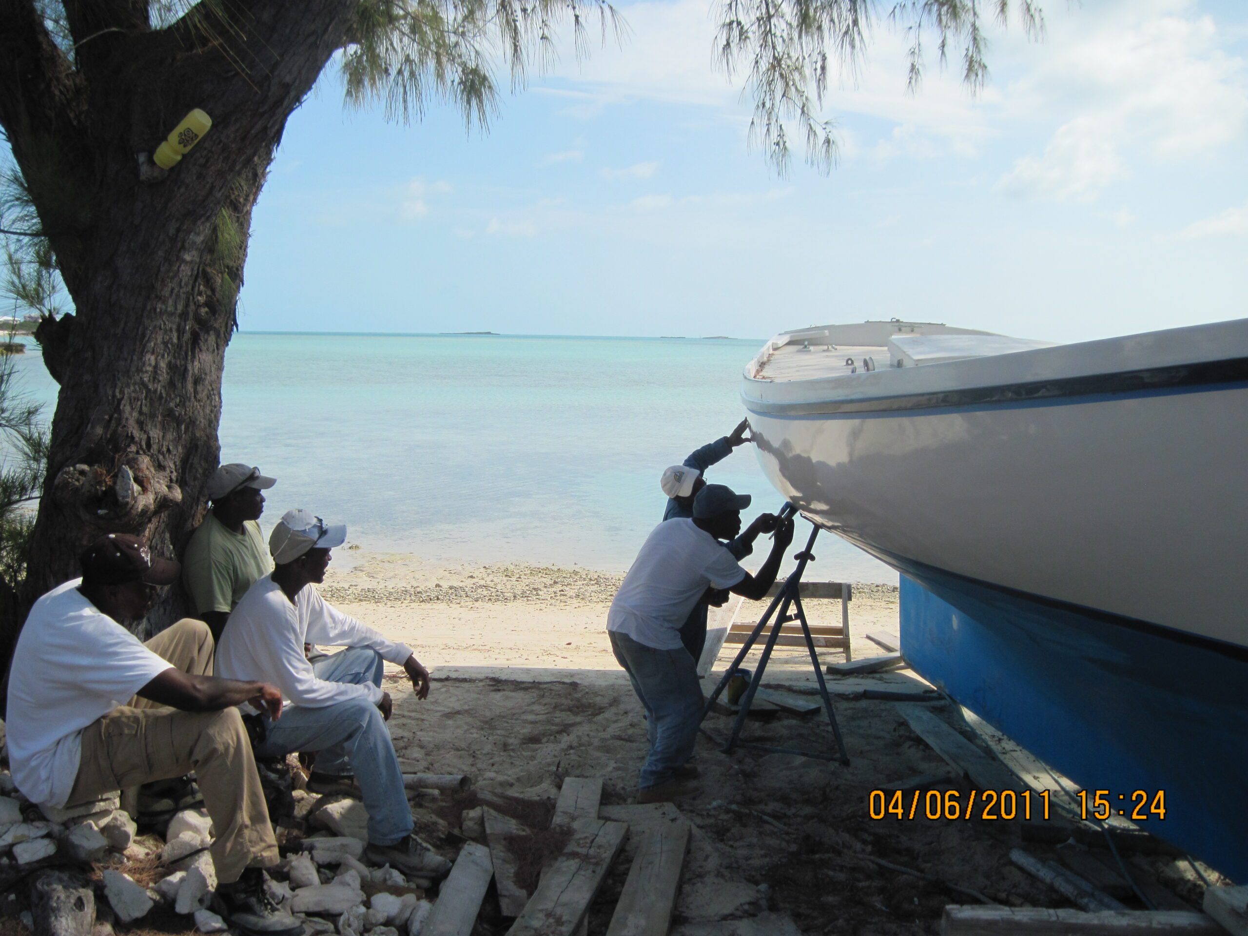 On the fourth day a small group had gathered to watch Joel and his crew hard at their labors. Laughing, Joel informs me this is the competition from the Lady Muriel that has come over to spy on him. Lady Muriel is in the same class as Tida Wave and has won her fair share of the Georgetown classic races. The Lady Muriel without her mast on a mooring in the harbor swelling up her planks. Lady M (as she is affectionately called here) was shining in the sun all gleaming white, she was waiting for some one to take her to the races! Right behind her the TERN is resting, preparing for her next passage. The sea birds sit, sh_t and chat on the rails of Lady M. What they talk about I have no clue but if I had to guess it's probably the upcoming Regatta in Georgetown. All fishermen know when a seabird sh_ts on you it is good luck. I think that is why they put Lady M out in the harbor so early. I am sure TIDA WAVE will get her share of bird poop before the race but she will be much lighter than Lady M because of her later launch date. We will know the outcome in a couple of weeks. I may take the mail boat from Bimini to Georgetown to see the race? Stay tuned for my Blurb on the Staniel Cay Yacht Club coming soon!